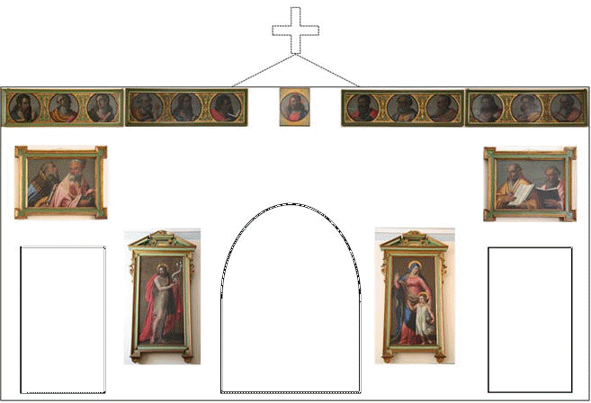 2 Una ipotesi alternativa è che essa in realtà non abbia mai fatto parte dell'arredo della chiesa, ma provenga da altro ambiente, forse una cappella interna del collegio. L'assegnazione tradizionale alla iconostasi, come la stessa paternità del Trabaldese, sono a nostro avviso state determinate dall'attuale collocazione su una parete del refettorio del collegio, tra il Battista e la Vergine, ma ignoriamo quando essa sia avvenuta. Probabilmente non è stata contemporanea all'intervento di Busiri Vici, ma ha avuto luogo successivamente, forse a distanza di decenni, quando si era persa memoria dell'originaria collocazione. Nel locale stesso, oltre agli altri elementi pittorici dell'iconostasi, sono presenti altre opere, di varie epoche che certamente non provengono dalla chiesa di Sant'Atanasio. (torna su)