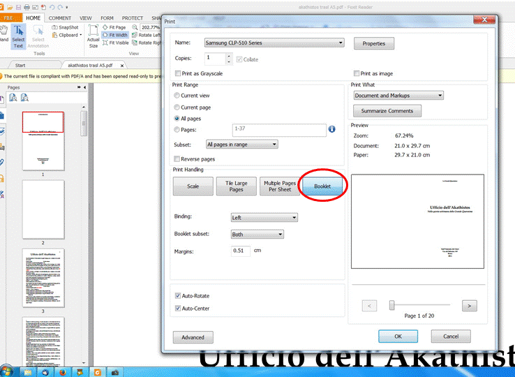 In entrambi i casi il testo verrà automaticamente riorganizzato e inviato alla stampante ponendo due pagine per facciata di un normale foglio A4 fronte retro: 1a ed ultima pagina su una facciata, 2a e penultima pagina sull'altra faccia del foglio, e così via in modo da ottenere un opuscolo semplicemente piegando a metà il pacchetto di fogli così ottenuto.